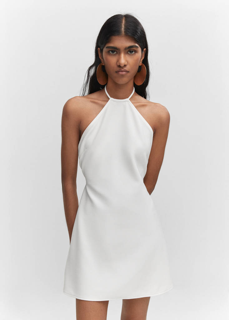 Tissu fluide. Coupe droite. Coupe courte. Col halter. Sans manches. Dos nu. Détail métallique. Lien à nouer autour du cou. Saison des festivals