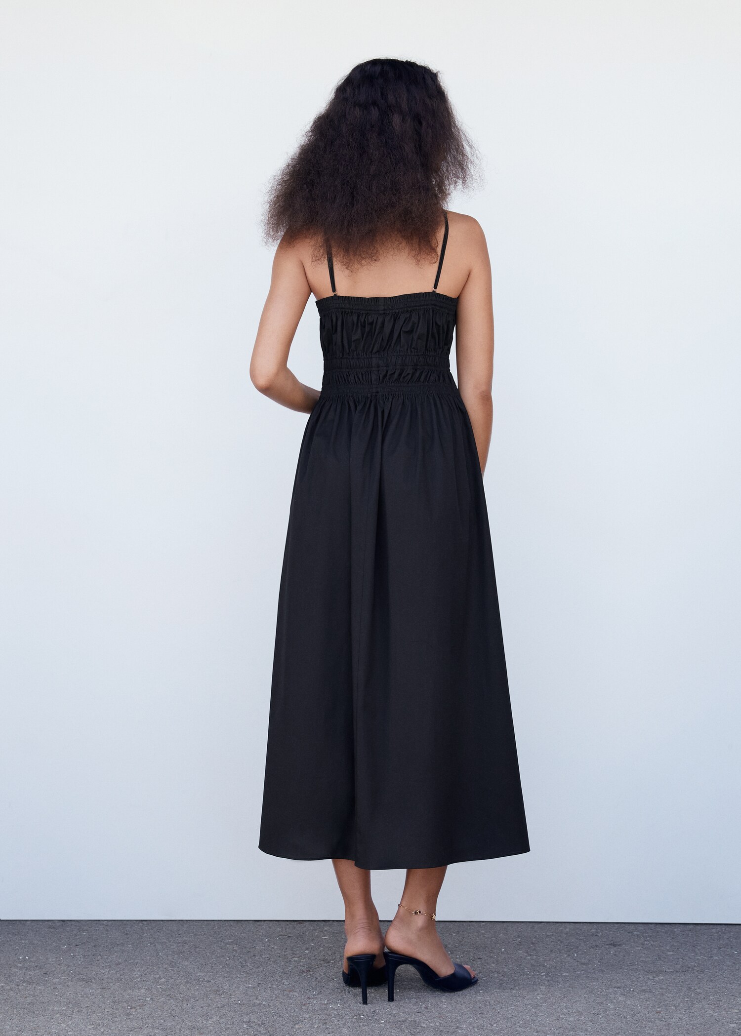 Tissu en coton. Coupe droite. Coupe longue. Emmanchures américaines. Bretelles fines ajustables. Encolure au dos. Sans fermeture. Fronce élastique. Collection fêtes et cérémonies.