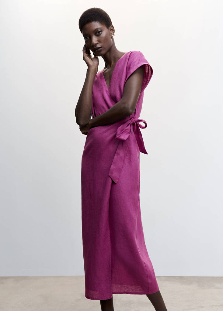 100 % lin. Coupe droite. Coupe midi. Croisé. Col croisé. Manches courtes retournées. Fermeture latérale à nœuds. Disponible Plus