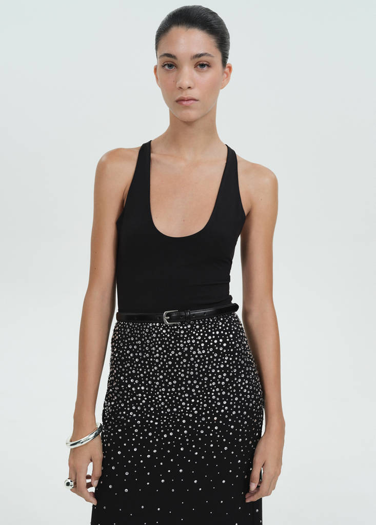 Tissage en maille jersey. Col échancré. Bretelles larges. Sans manches. Sans mousse. Fermeture à boutons-pression. Collection fêtes, cérémonie et communion. Collection Selection