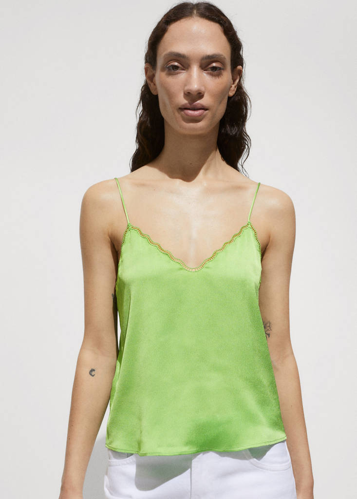 Top satiné bretellesPrix actuel [25,99 € ]25,99 €Choisissez une couleurVertLe mannequin porte la taille S et mesure 178cm.Choisissez votre tailleXXSXSSMLXLXXLMesuresAjouter aux FavorisVoir le lookLivraison gratuite en boutiqueTissu satiné. Coupe droite. Encolure en V. Sans manches. Bretelles fines. Détail dentelle. Saison des festivalsDétails, composition et entretienDisponibilité en boutique