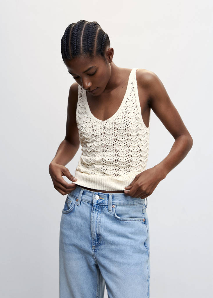 Top maille détails ajourésPrix actuel [25,99 € ]25,99 €Choisissez une couleurÉcruLe mannequin porte la taille S et mesure 180cm.Choisissez votre tailleXSSMLMesuresAjouter aux FavorisVoir le lookLivraison gratuite en boutiqueTissu en grosse maille. Tissu ajouré. Coupe droite. Col en V. Bretelles larges. Sans fermeture. Total lookDétails, composition et entretienDisponibilité en boutique