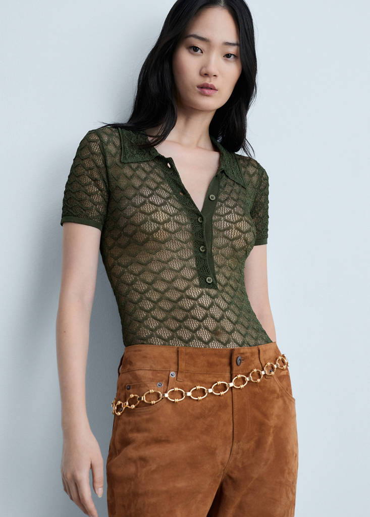 Tissu en maille fine. Tissu ajouré. Design semi-transparent. Col polo. Manches courtes. Fermeture à boutons au col. Fermeture métallique à pression