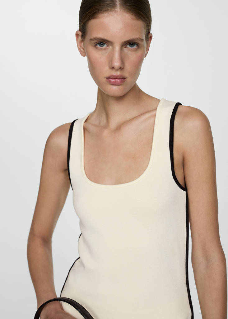 Maille fine. Coupe droite. Col rond. Bretelles larges. Détail liseré contrasté