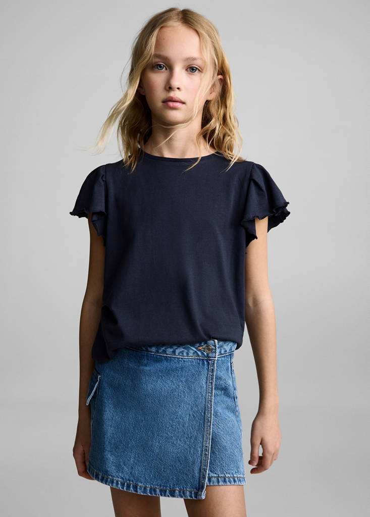 Short-sleeved ruffle t-shirtCurrent price [39,99 LEI ]39,99 LEISelect a colourDark NavySelect your size5-6 years (116cm)Not available. I want it!7-8 years (128cm)Not available. I want it!9-10 years (140cm)Not available. I want it!11-12 years (152cm)Not available. I want it!13-14 years (164cm)Not available. I want it!DimensionsNotify meAdd to WishlistSee lookFree delivery to store100% Cotton. Round neck. Short-sleeved ruffleDetails, composition and careStore availabilityItem qualitiesRecycled cottonAt least 20%This fibre is obtained from pre- and post-consumer textile waste that is transformed into new fabrics.