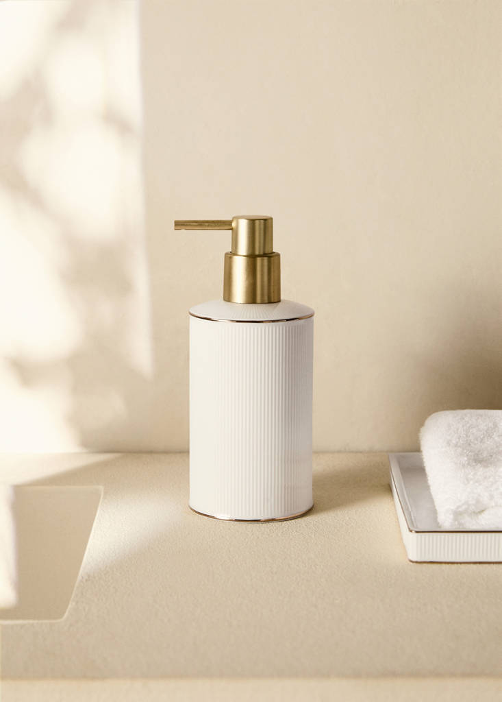 100% stoneware. Size: 7.5x17.7 cm. Stripe detail. Contrast edge. Its elegant design will add a touch of sophistication to your bathroom. Combines functionality and elegance. Coordinates with more products from the collection. Gold-rimmed. Elegant design that adds a touch of sophistication and understated luxury to your bathroom