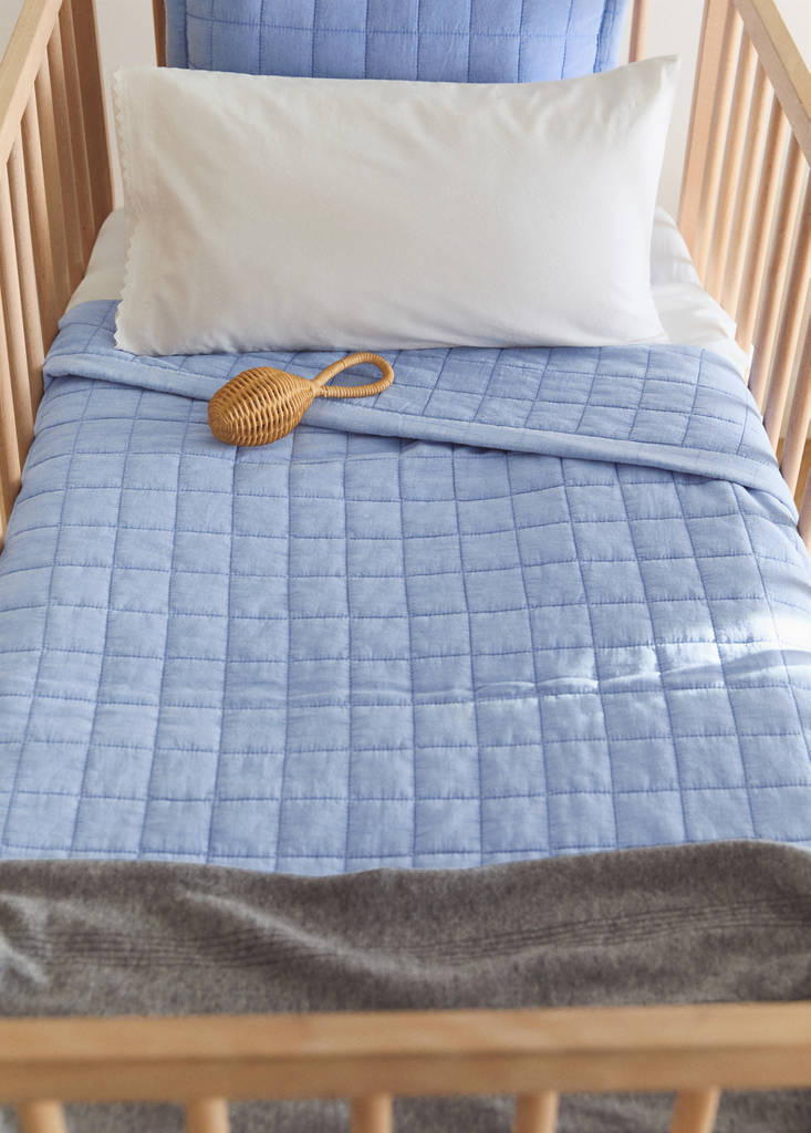 Size: 90x120 cm. For a cot. 100% Cotton. Quilted design. Washed cotton. Soft, relaxed aesthetic, matte finish, subtly crumpled. Stitched check design. Available in different colours. Combine with the matching cushion. This product does not include pillowcases
