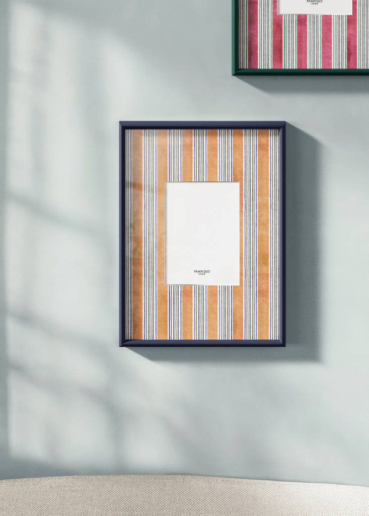 For photos measuring 15x21 cm. Frame size: 38x53 cm. Two-tone striped background detail. Wood material. Add a colourful and original touch to any space. Archive your photos and memories. Available in different colours