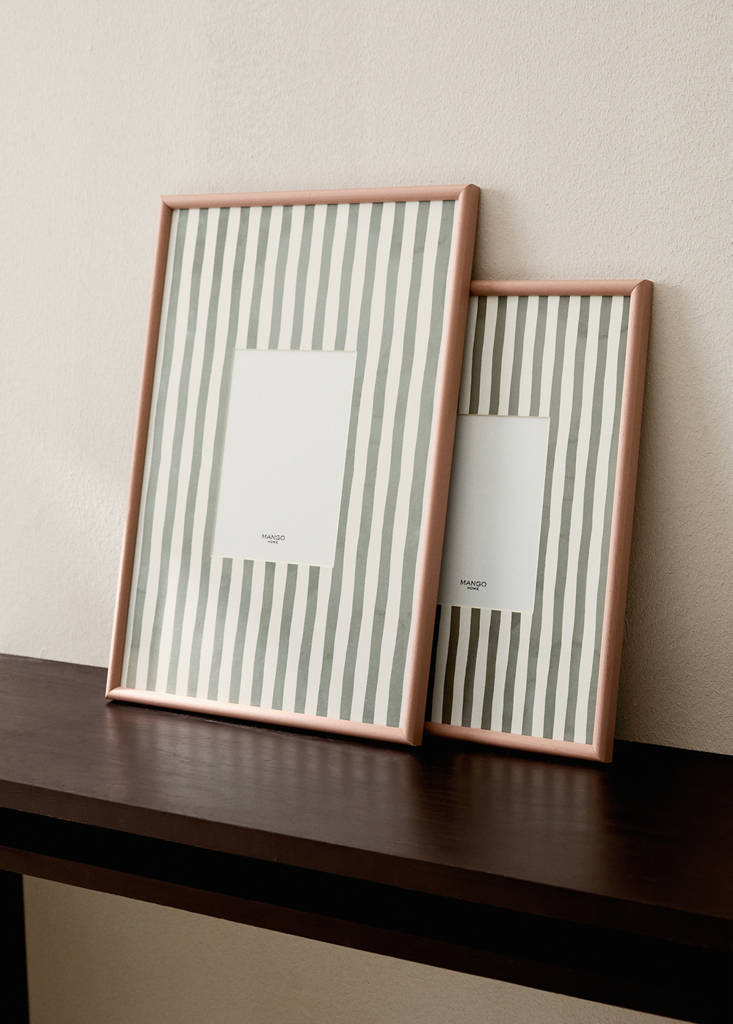 For photos measuring 15x21 cm. Frame size: 38x53 cm. Two-tone striped background detail. Wood material. Add a colourful and original touch to any space. Archive your photos and memories. Available in different colours