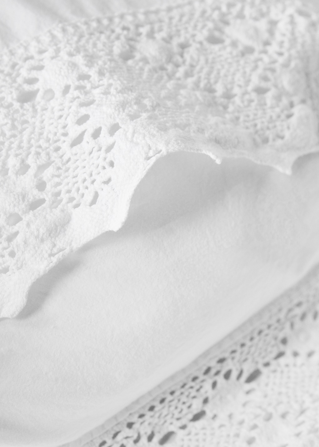 100% Cotton. Size: 50x75cm. Pack of 2. Made in Portugal. 200-thread count percale cotton. Garment-dyed cotton fabric. Wide lace trim with a classic and timeless finish. Filling not included. Complete with the products from the collection.