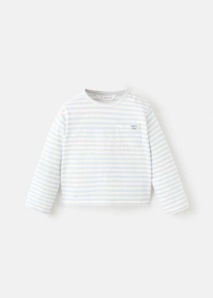 Crafted from 100% cotton fabric, this garment features a straight design with a striped print. It includes a round neck with button closure, long sleeves, and a patch pocket on the chest with a decorative patch.