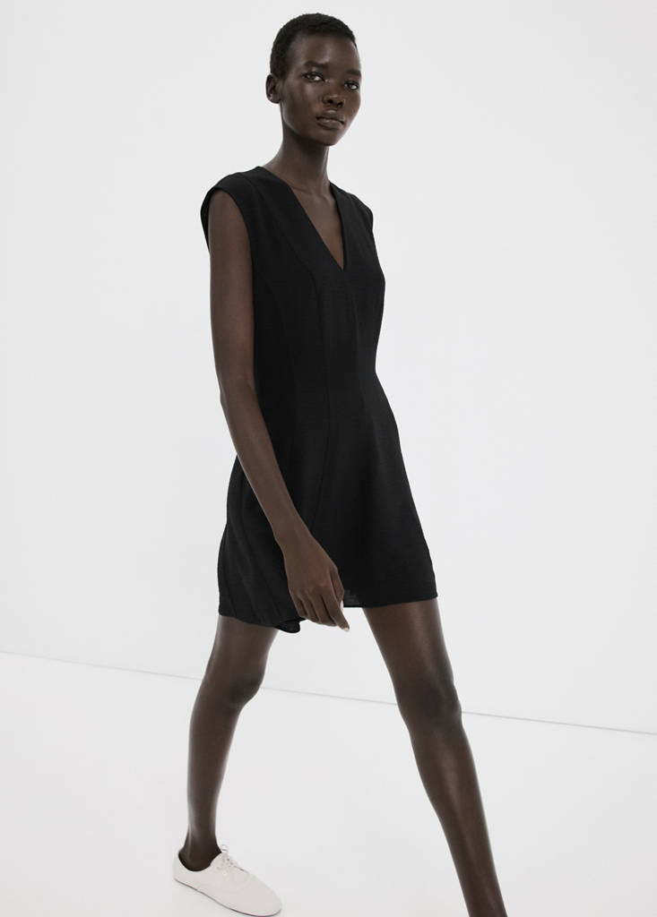 Short design. A-line design. V-neck. Sleeveless. Wide straps. Ruffle hem. Back zip fastening. Inner lining