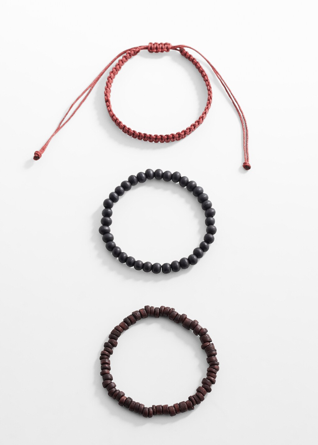 Pachet de 3 bucăți. Mărgele din lemn. Finisaj elastic. Închidere cu nod fals.