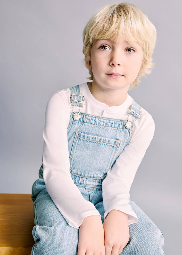Material denim din 100% bumbac. Design drept. Design lung. Guler drept. Bretele încheiate cu nasturi. Bretele reglabile. Închidere laterală cu nasturi. Două buzunare laterale. Două buzunare aplicate la spate. Buzunar aplicat pe piept