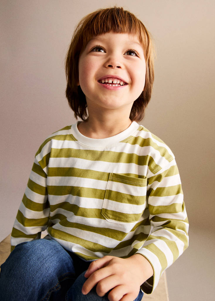 Țesătură 100% bumbac. Design drept. Model cu dungi. Guler rotund cu finisaj nervurat. Mâneci lungi. Buzunar aplicat pe piept