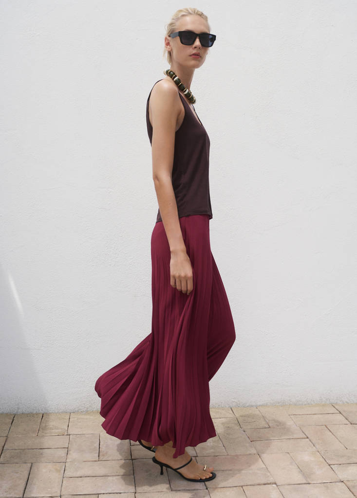 Confecționată cu țesătură fluidă, această piesă vestimentară are un model lung și plisat. Talia medie este completată cu o bandă elastică, fără sistem de închidere, pentru un confort și o potrivire mai bună
