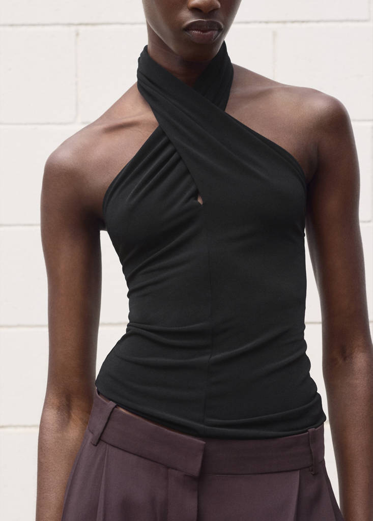 Design mulat. Guler halter. Guler încrucișat. Fără mâneci. Fără sistem de închidere