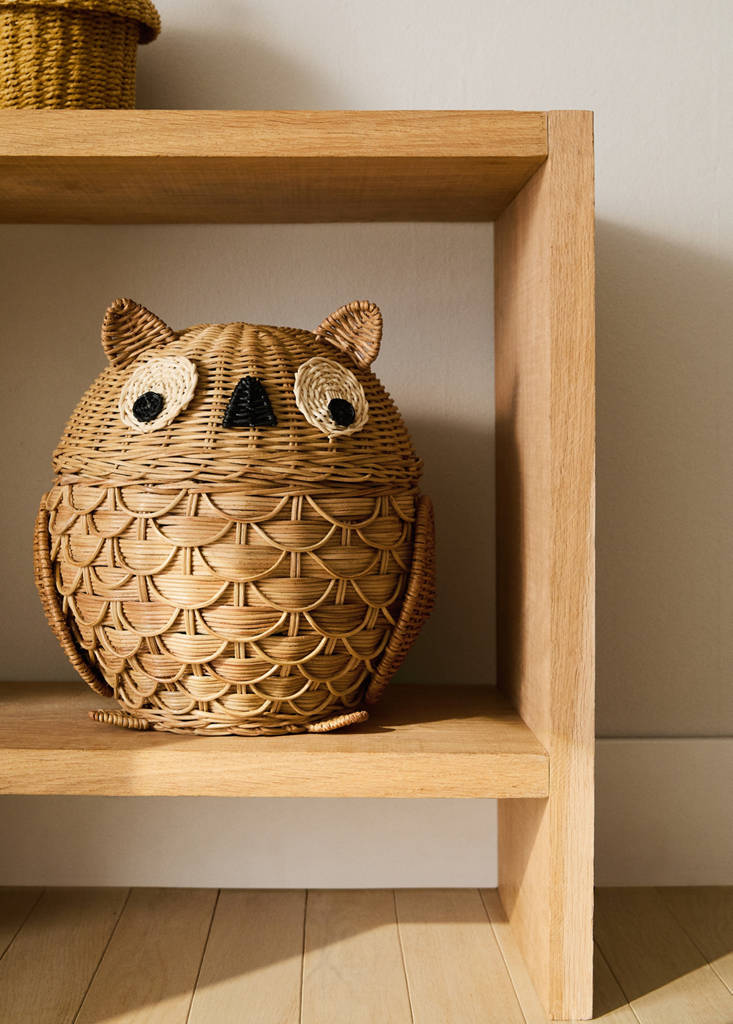 Dimensiuni: 28x26x31 cm. 100% ratan. Model bufniță. Cu textură. Formă ovală. Cu capac. Ideală pentru depozitare sau ca element decorativ