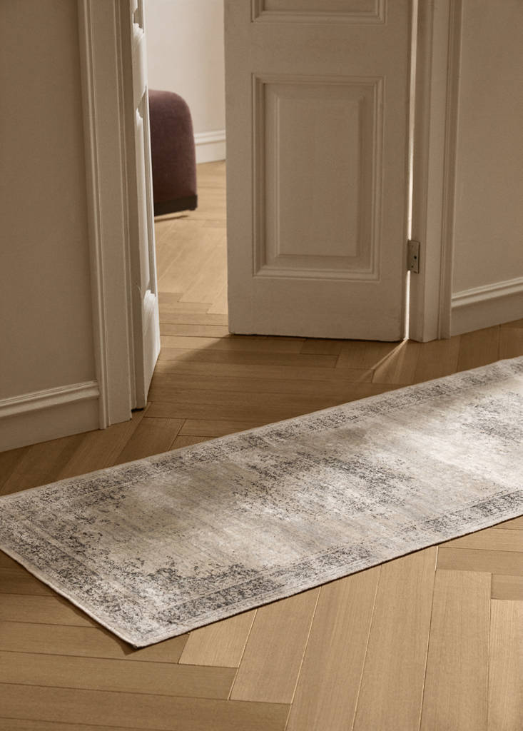Bumbac și vâscoză. Dimensiune: 70x200 cm. Fabricat în Spania. Modelul central complex combină forme florale și arabescuri cu un efect uzat sau învechit, conferindu-i un caracter vintage și sofisticat. Modelul estompat creează un efect vizual blând și armonios, ideal pentru camere în stil clasic sau boem. Disponibil în mai multe dimensiuni