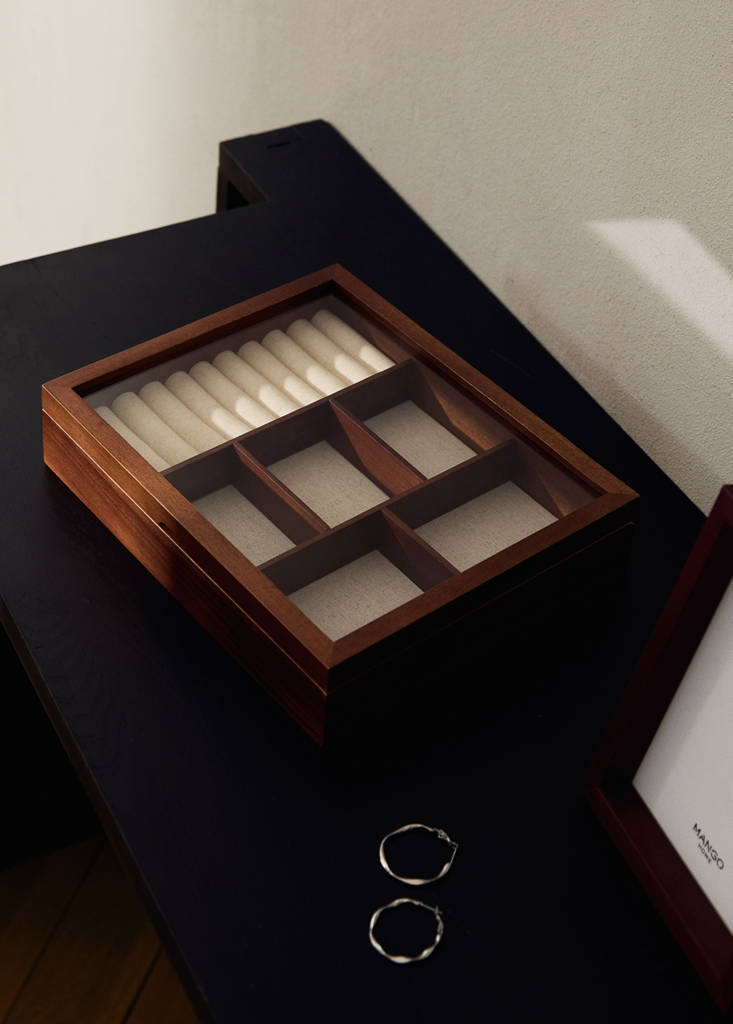 Cutie de bijuterii. Dimensiuni: 30x23x6 cm. Confecționat din lemn. Țesătură de bumbac. Cu capac. Ideală pentru depozitarea și organizarea bijuteriilor tale. Îmbină funcționalitatea și eleganța