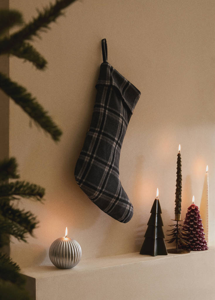 Cizmă pentru Crăciun. Țesătură din lână. Imprimeu pătrățele. Disponibil în diferite culori. Se combină cu mai multe produse din colecție