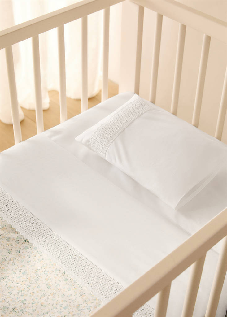 Include cearceaf superior și husă de pernă mini pentru pătuț. 100% Bumbac. Țesătură de bumbac percal. 200 de fire. Dimensiuni: 75x100 cm + 20x30. Broderie spartă. Proaspăt, fin, durabil, transpirabil, versatil