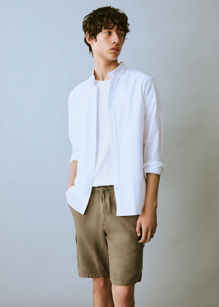 Țesătură din bumbac și in. Design drept. Două buzunare cargo. Talie cu bandă elastică. Șnur în talie. Două buzunare frontale