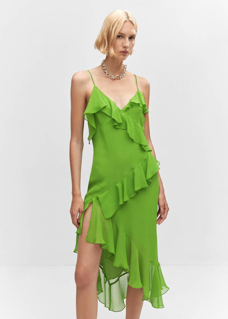 Gauze fabric. Fluid fabric. Asymmetric design. Midi design. Low neckline. Thin straps. Back neckline. Zip fastening. Ruffle detail. Inner lining. Party, ceremony and communion collection. Fitted design