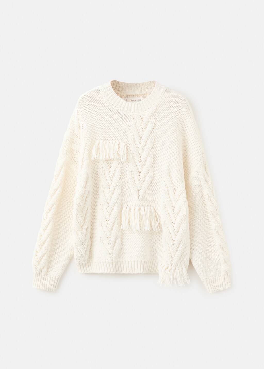 Cotton fabric. Fine herringbone knitted fabric. Oversize style. Round neck. Long sleeves. Ribbed collar, cuffs and hem. Fringe detail.
