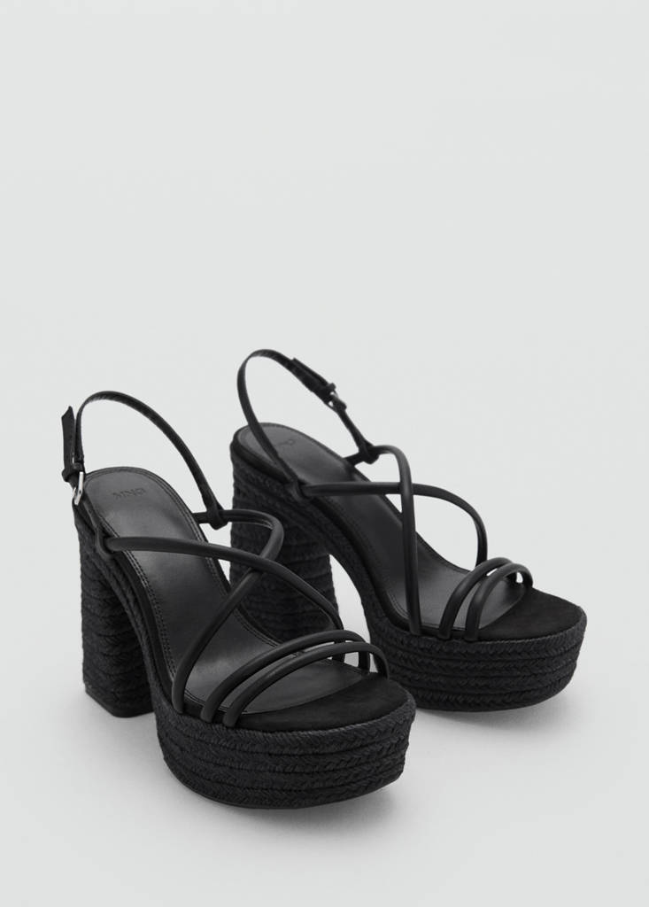 Heeled esparto sandal with strapsCurrent price [din. 5,490.00 ]din. 5,490.00Select a colourBlackSelect your size35Not available. I want it!36Not available. I want it!37Not available. I want it!38Not available. I want it!39Not available. I want it!MeasurementsNotify meAdd to WishlistSee lookFree delivery to storeStraps design. Crossed strap design. Front opening. Platform at the front part. Wide heel. Block heel. 10 cm heel. Ankle strap closure. Party and events collectionDetails, composition and careStore availability