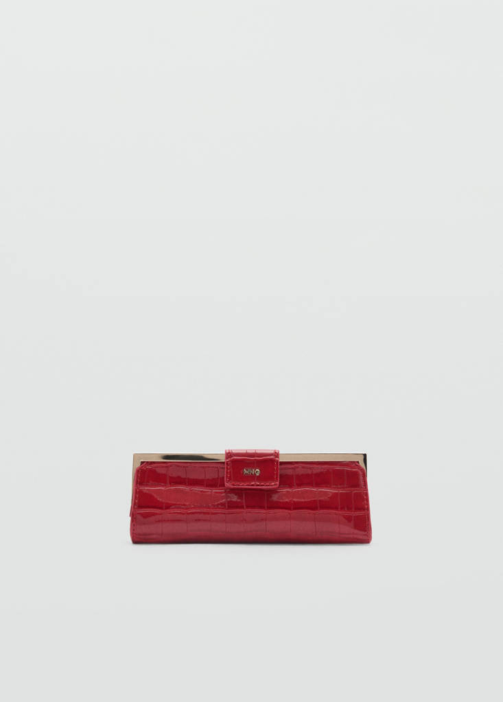 Crocodile effect. Clutch style. Handle. Magnetic fastening on the front. Debossed logo. Inner lining