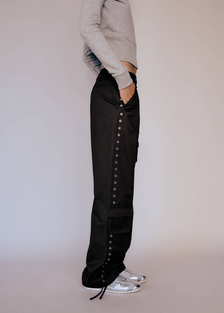 Ткань 100% хлопок. Парашюты. Длинный дизайн. Прямой крой. Карманы карго. Застежка-молния и пуговица. Шлёвки. Два боковых кармана. Два задних кармана с кантом. Регулируемый низ. Декоративные заклепки