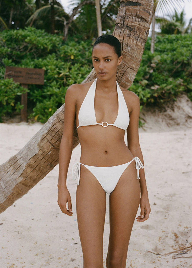 Треугольные чашечки. На шее и спине завязки. Декоративное кольцо. Внутренняя подкладка. Доступный комплект