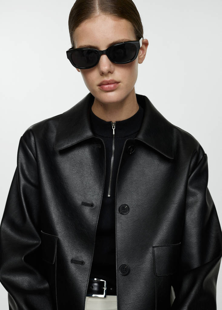 Короткая длина. Прямой крой. Эффект кожи. Рубашечный воротник. Длинные рукава. Два кармана с клапанами спереди. Подкладка. Передняя застежка на пуговицы