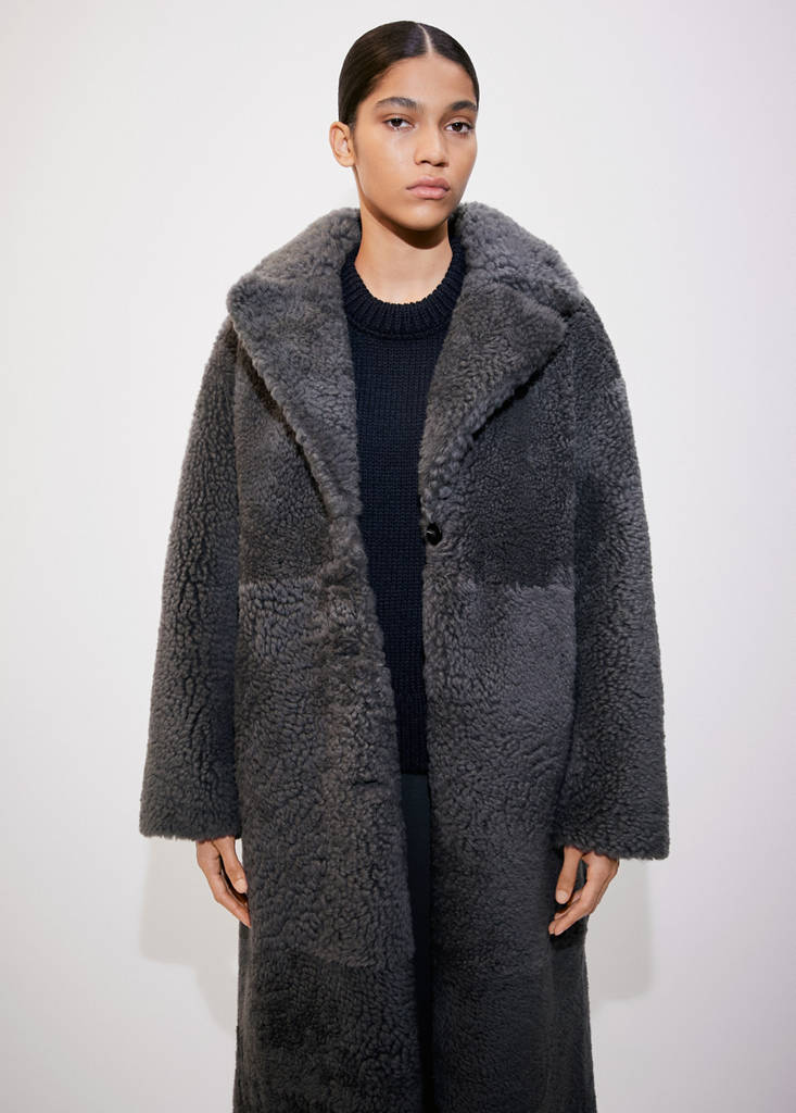 Коллекция Beyond. 100% овечья кожа. Тяжелая структура. Длинный дизайн. Прямой крой. Дизайн с обратной стороной. V-образный вырез горловины с лацканами. Длинные рукава. Боковые карманы. Задний разрез внизу. Передняя застежка на пуговицы