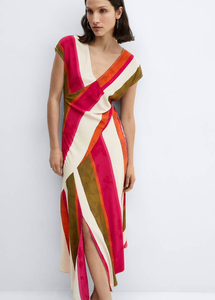 Текучая ткань. Миди-дизайн. Длинный дизайн. Дизайн трапеция. Принт в полоску. V-образный вырез. Короткий рукав. Сзади потайная застежка на молнию. Сбоку разрез. Асимметричный низ. Приталенный дизайн