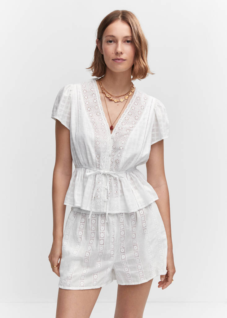 Прямой крой. V-образный вырез. Короткий рукав. Застежка на пуговицы спереди. Регулируемая завязка. Ажурные детали. Вышитые детали. Ткань 100% хлопок