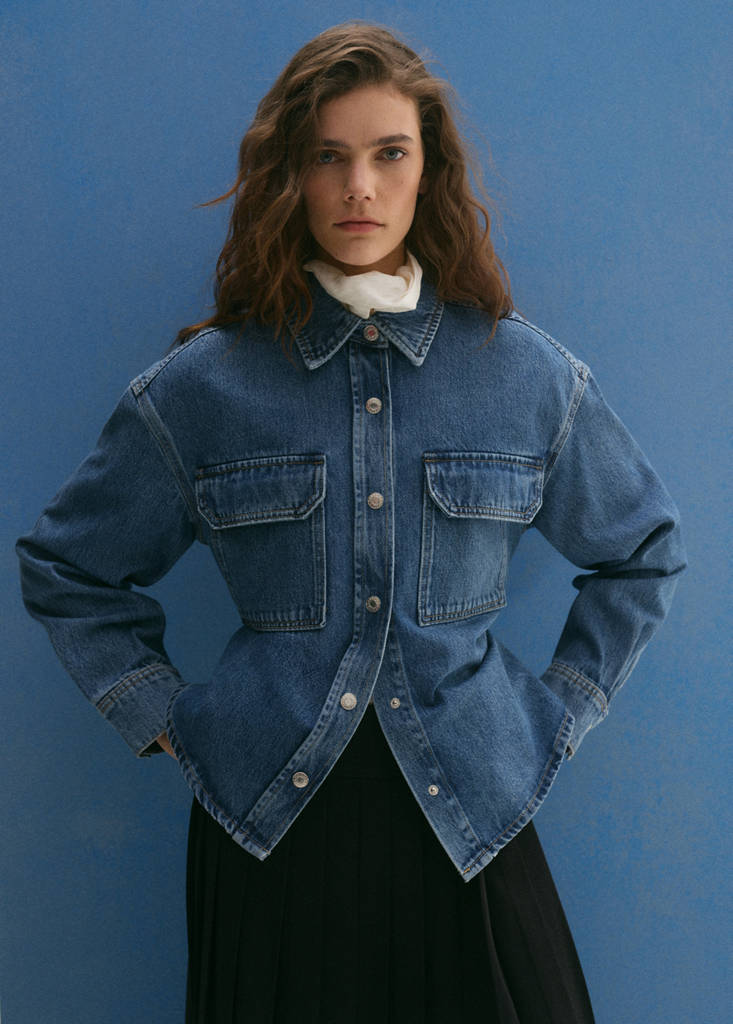 Хлопковая ткань в стиле джинсовой ткани. Прямой крой. Рубашечный воротник. Длинные рукава с застежкой на пуговицы. На груди два накладных кармана с клапанами. Передняя застежка на кнопки