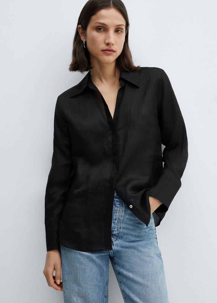 Ткань из рами. Прямой крой. Рубашечный воротник. Длинные рукава с застежкой на пуговицы. Спереди потайная застежка на пуговицы. Доступно Plus
