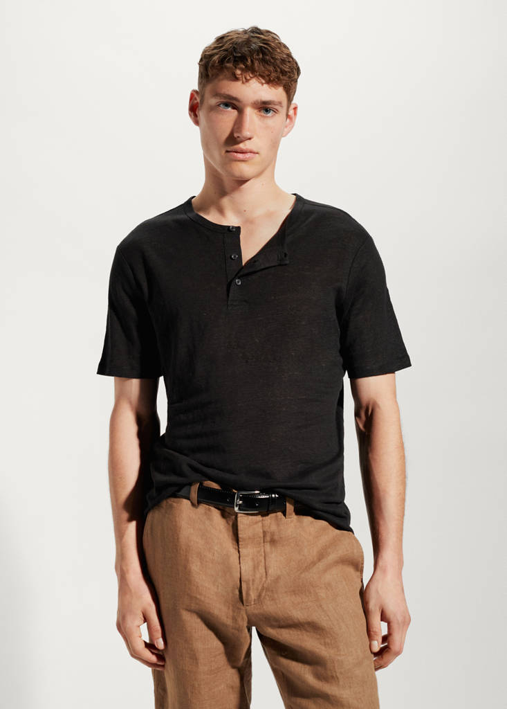 Льняная ткань. Slim fit. Легкая ткань. Вырез горловины хенли. Круглый вырез. Короткий рукав. Прямой низ. Коллекция базовых вещей