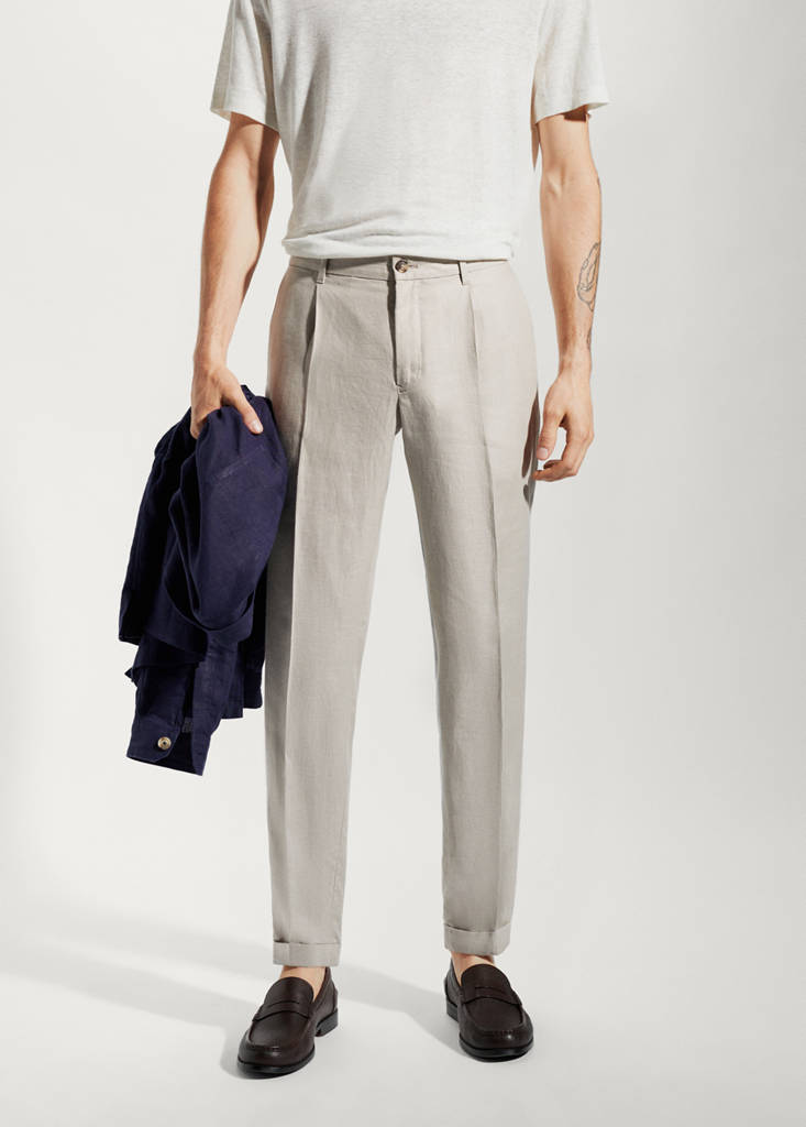 Ткань: 100% лен. Прямой крой. Спереди и сзади защипы. Двойная застежка на пуговицу и молнию. Два передних кармана. Два прорезных кармана с пуговицей сзади. Штанины с отворотами