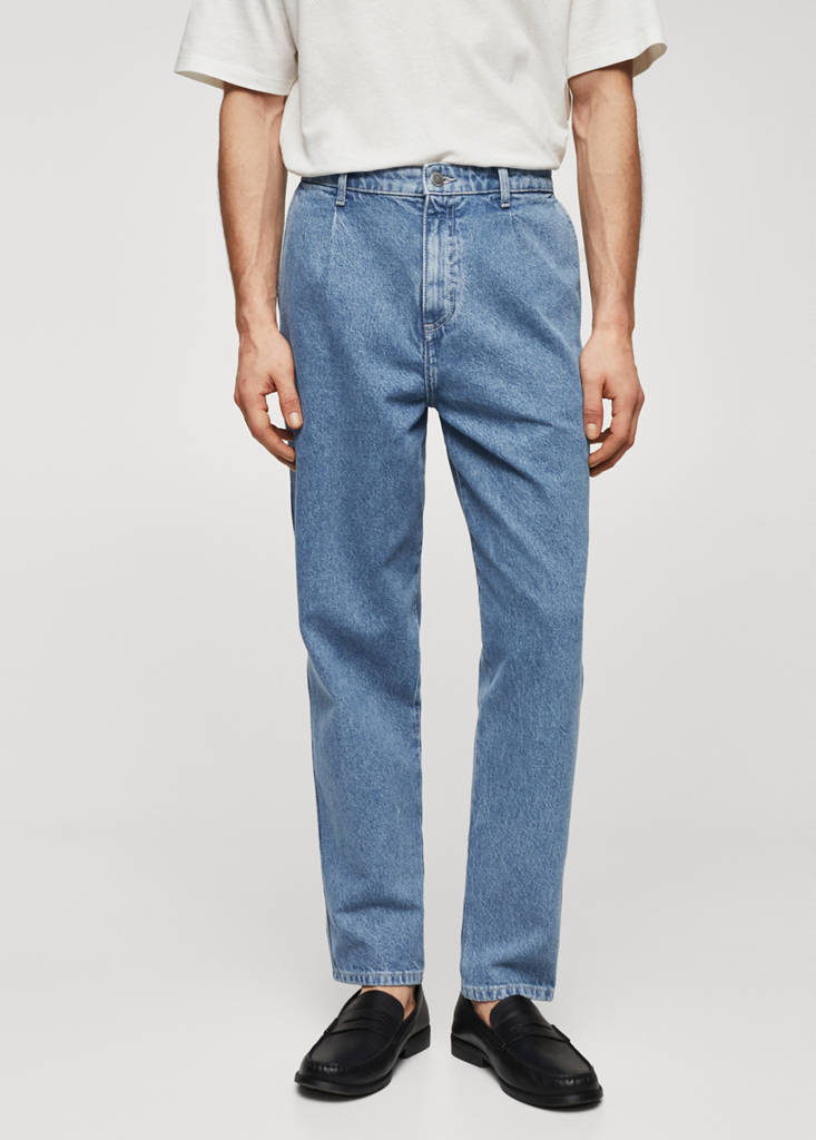 Slouchy-fit: высокая посадка и широкие штанины, слегка сужающиеся к щиколоткам. Органический хлопок. Хлопковая ткань в джинсовом стиле. Спереди защипы. На поясе хлястики. Застежка на молнию и пуговицу. Спереди два кармана. Сзади два накладных кармана с пуговицами. Рост модели: 187 см, размер: 42. Стиль джинсов