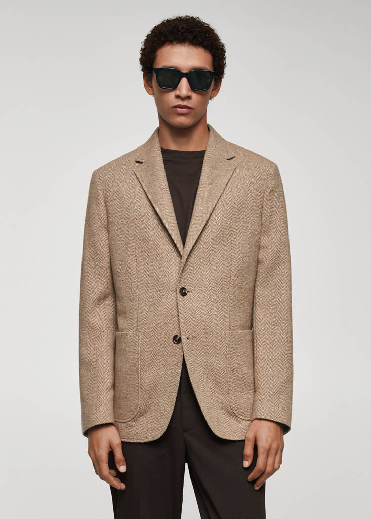 Slim fit. В состав входят шерсть и переработанный полиэстер. Воротник с лацканами. Спереди накладной карман. Длинные рукава. Прямой низ. Частичная подкладка. Внутренний карман. Передняя застежка на пуговицы. Узор в елочку