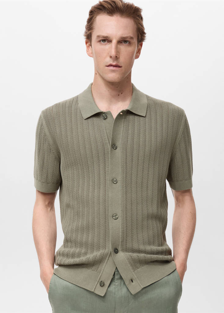 Прямой крой. Ткань 100% хлопок. Тонкая вязка. Короткий рукав. Прямой низ. Застежка на пуговицы спереди