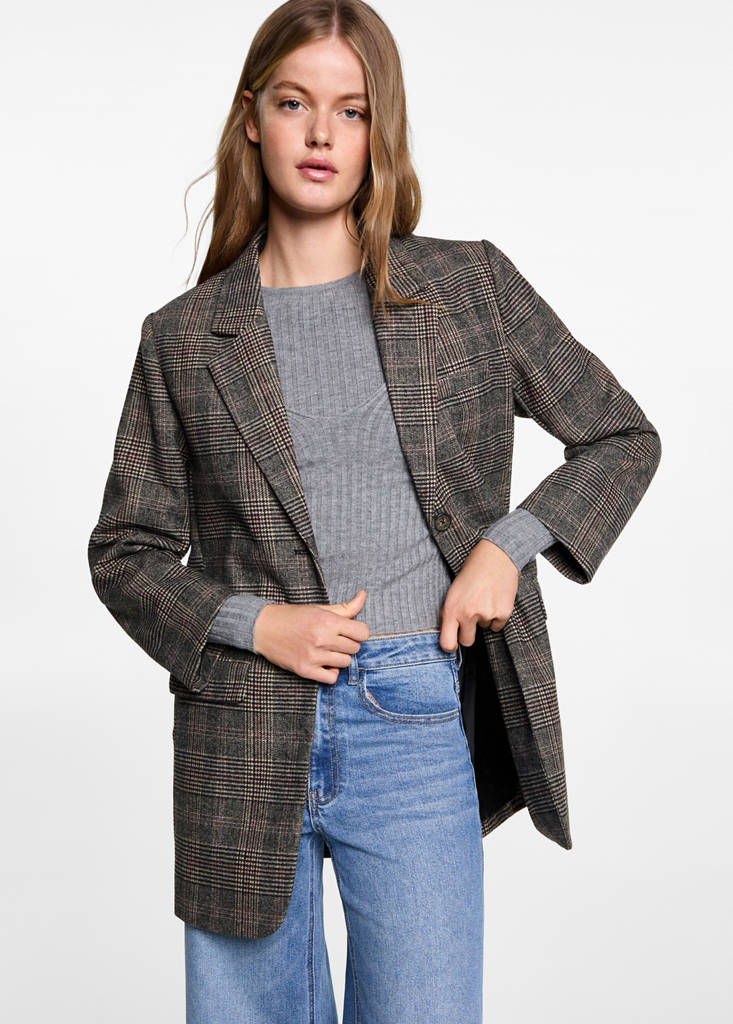 Лацканы с заостренными уголками. Дизайн в клетку. Прямой крой. Застежка на пуговицы. Ткань из шерсти. Длинные рукава. Два боковых кармана