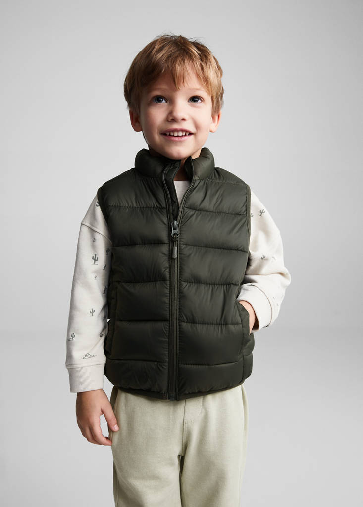 Quilted design. High neck. Sleeveless. Front closure. Two pockets with flaps. Standard design. Straight design. Back to school. Lightweight fabric. Zip fastening. Internal label for personal data. Polyamide fabric. Basics Collection