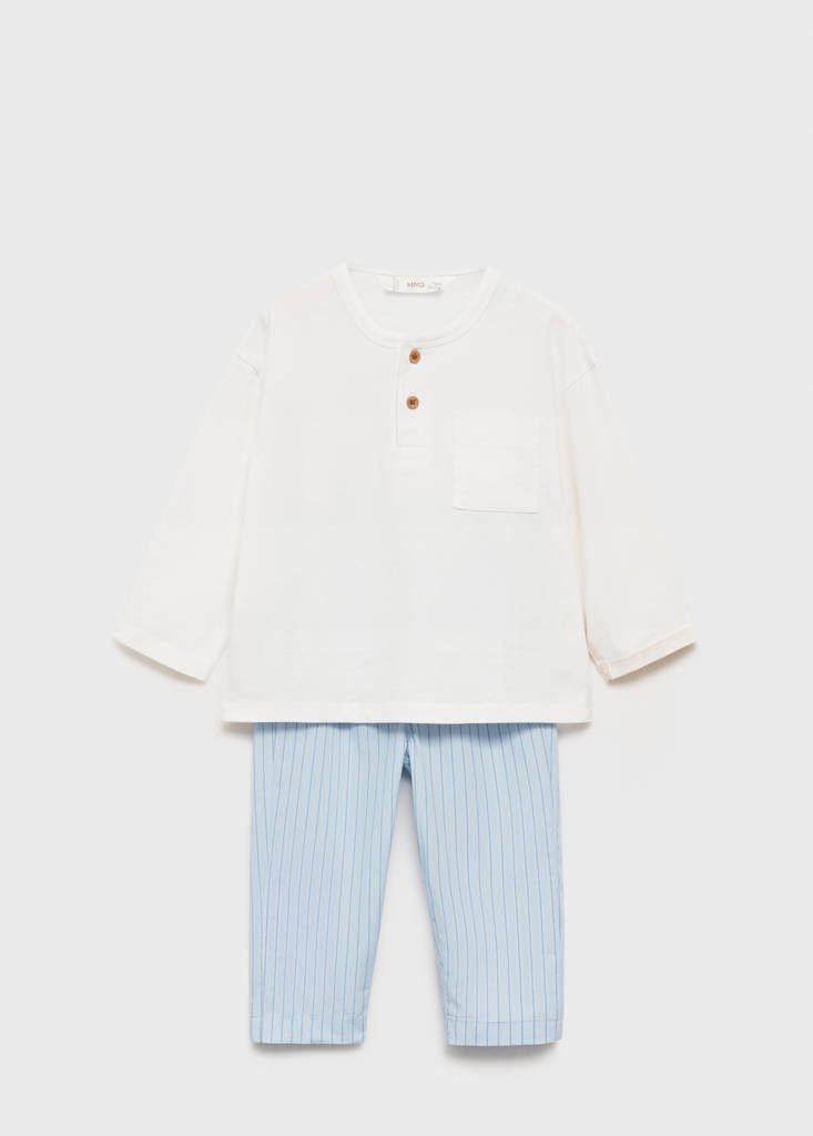 T-shirt and pyjama trousers set. 100% Cotton. Straight design. Buttoned collar. Striped design. Round neck. Long sleeves. Elasticated waistband