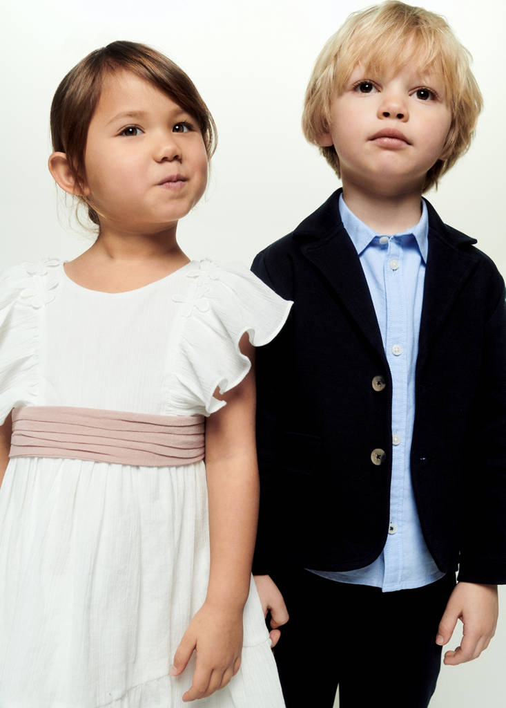 Party, ceremony and communion collection. Midi design. Flowered embroidery. Ruffles on the hem. Round neck. Short sleeves. Button up. Belt buckle fastening