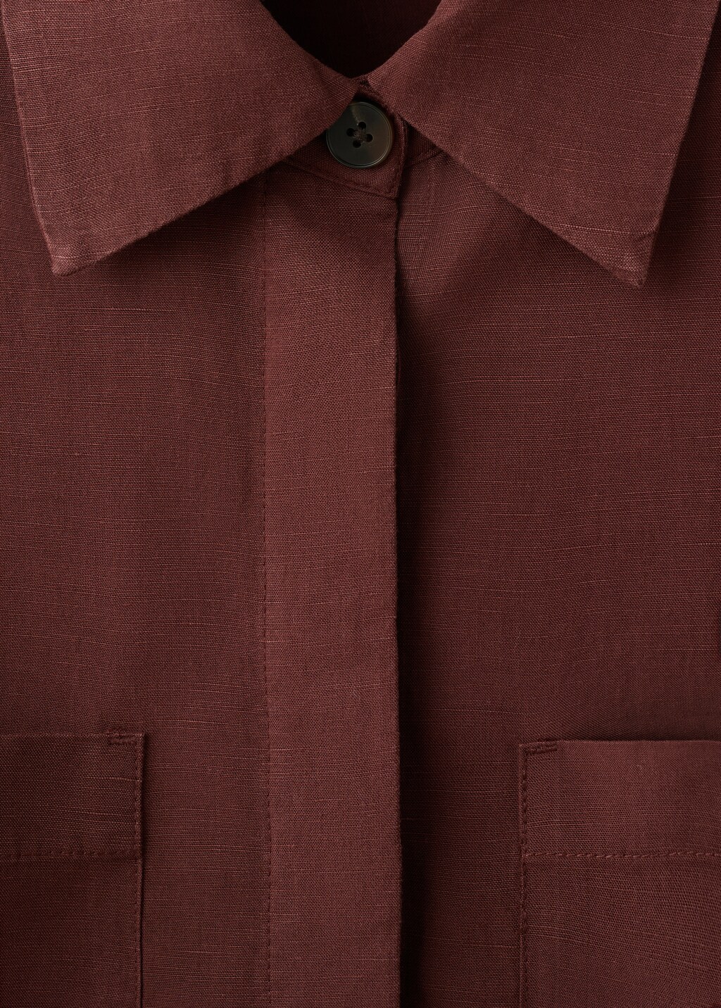 Linen and lyocell blend fabric. Oversized design. Shirt collar. Long sleeves with buttoned cuffs. Two patch pockets at the front. Front closure with buttons. Total look