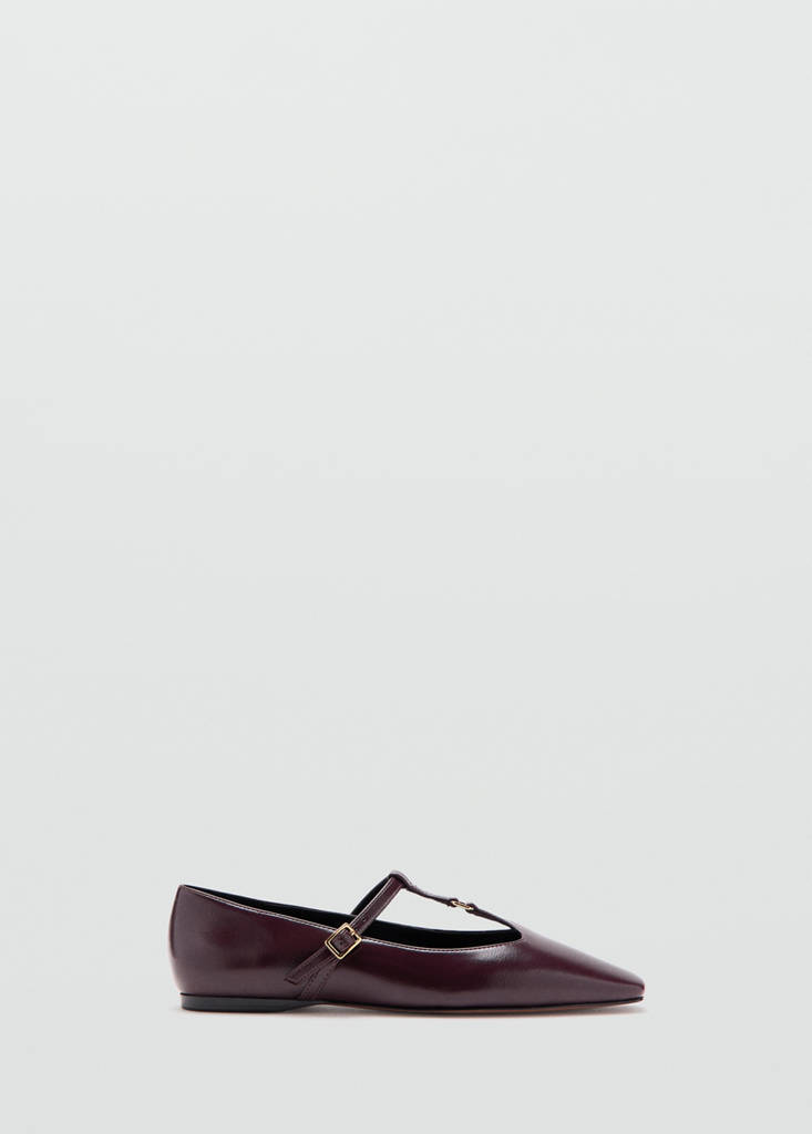 Faux leather. Flat. Square-toe. Crossed strips. Buckle closure